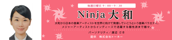 新番組「Ninja大和」 2015/02/10 放送日時 毎週日曜日 9:00〜9:30 放送内容 大和から日本の音楽アーティストを世界に向けて発信していこうという音楽バラエティ。メジャーアーティストからインディーズで活躍する個性派まで様々。ベトナムと文化交流の懸け橋となる番組です。 担当DJ 渡辺 さき 提供 株式会社トーホー 共有:Facebook で共有 (新しいウィンドウで開きます)クリックして Twitter で共有 (新しいウィンドウで開きます)
