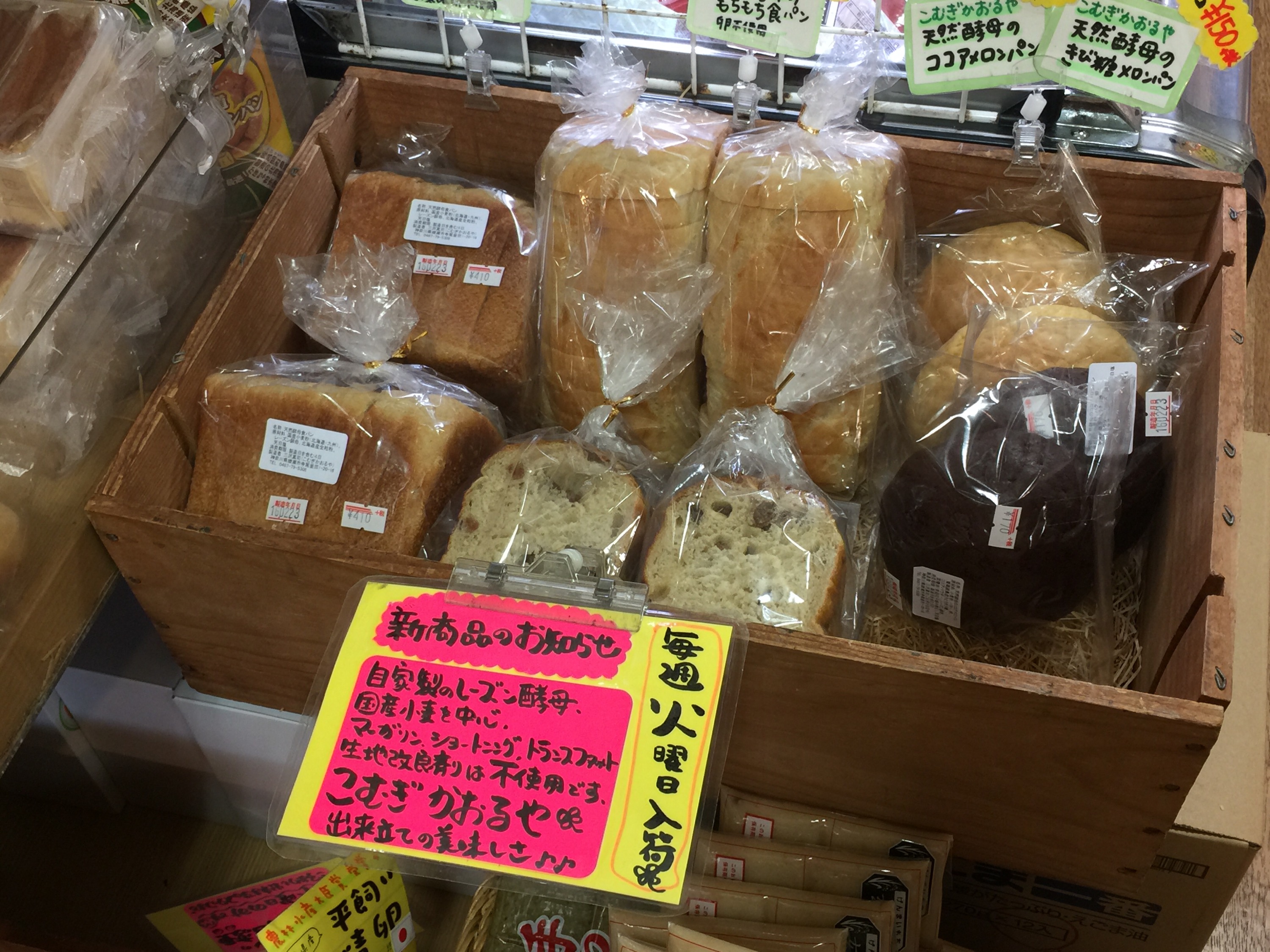 入り口に並んでいるとれたて野菜や果物。ヘルシーなパンも!