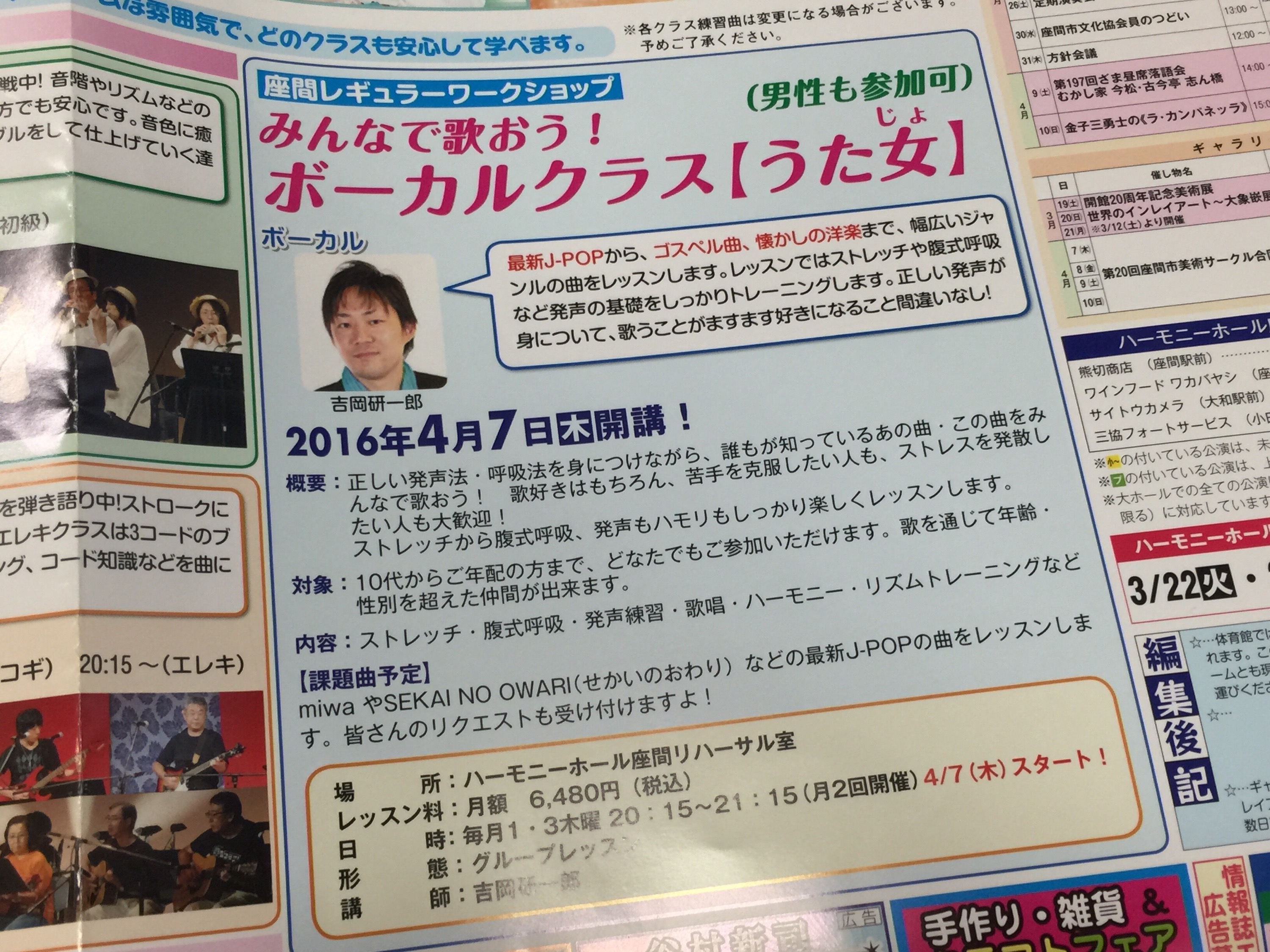 本日は、このレギュラーワークショップに4月から新しく開講するボーカル教室をご紹介しました。