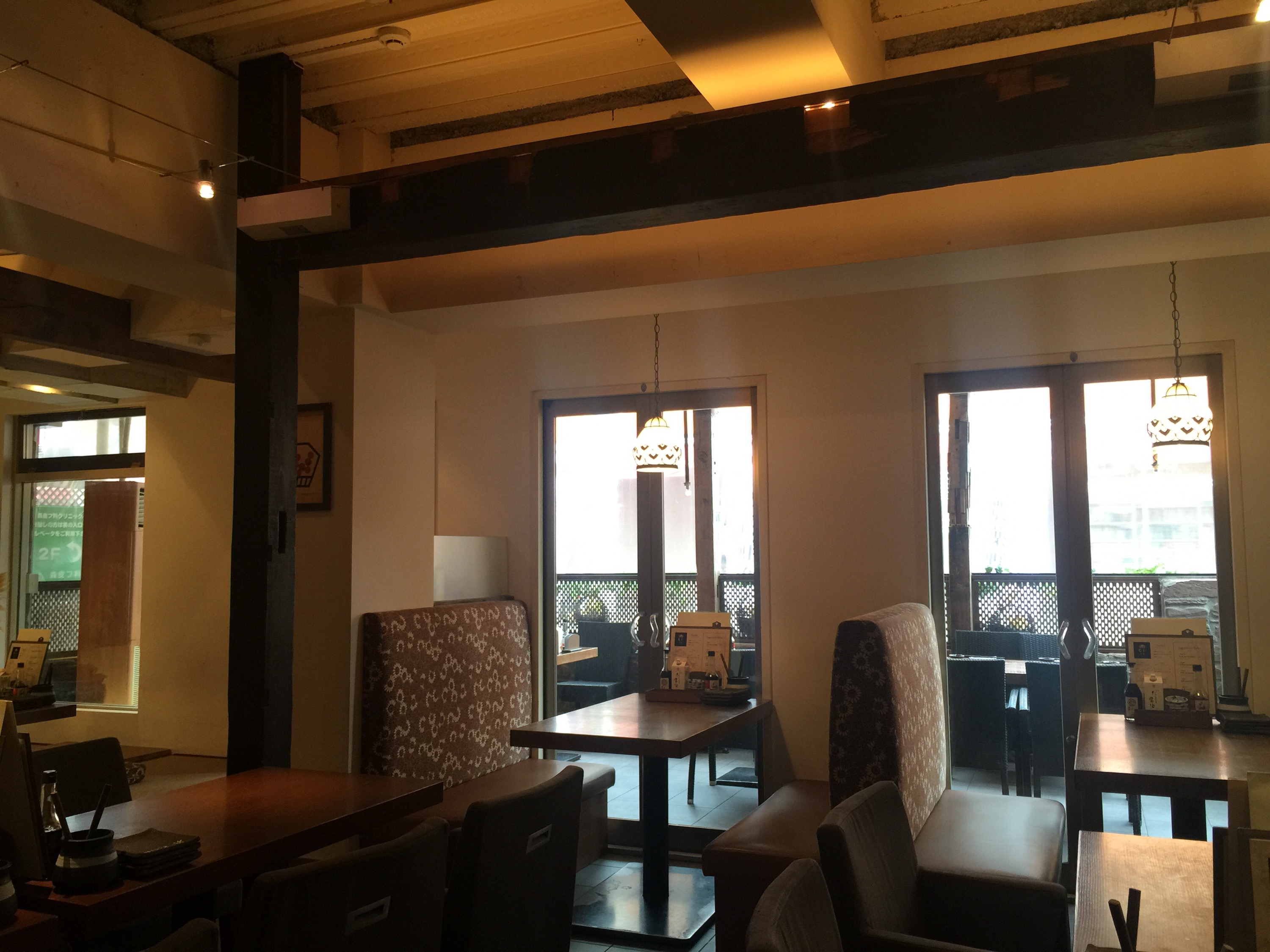 店内はこんな感じ!柱や梁に古い建材を使用しつつも、白い壁がモダンさを演出しています。