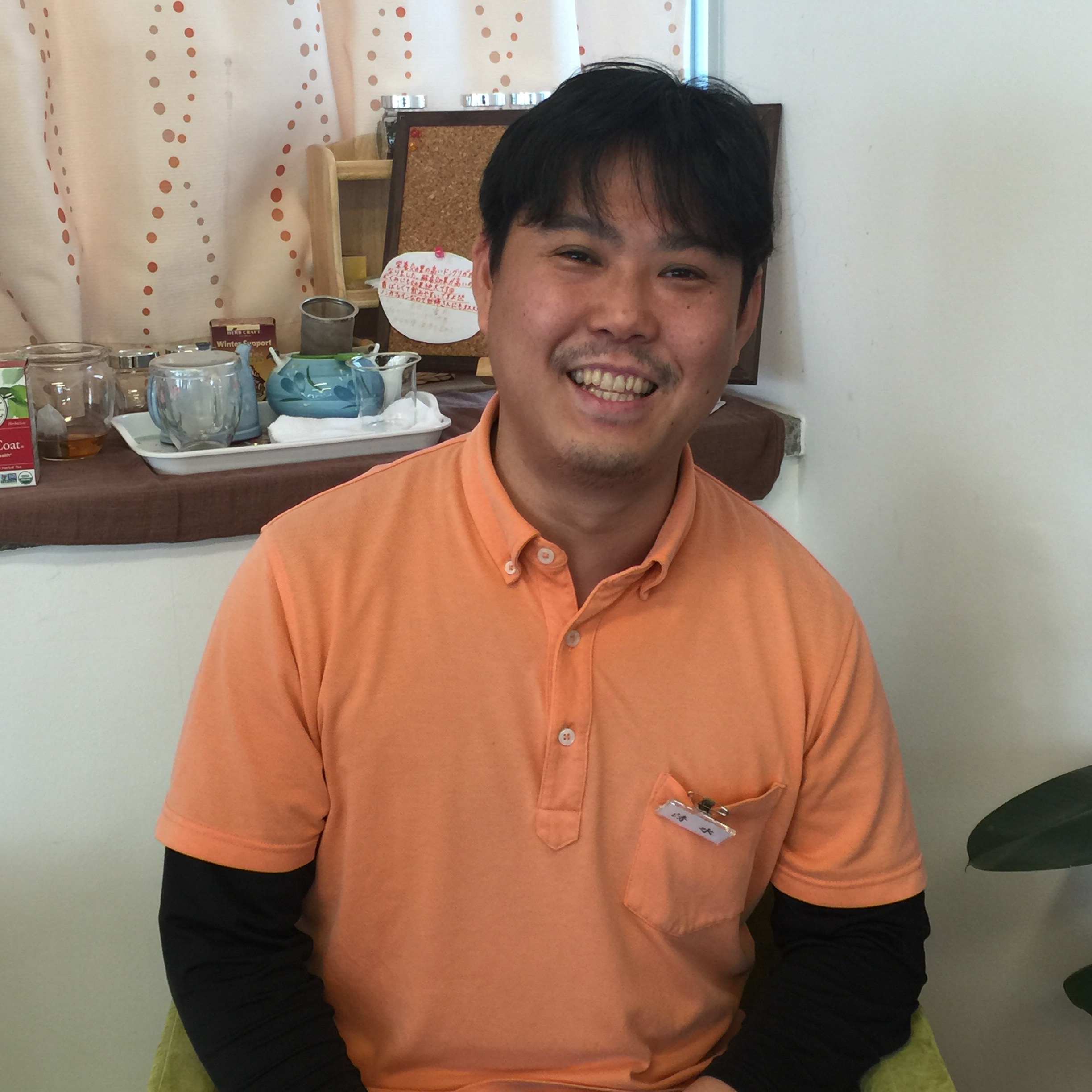 暖かい笑顔!家族がよく整体や接骨院に通っている姿を見て、自分がやってあげられたらいいなあと思ったことが整体師になったきっかけだそうです。優しい(T_T)