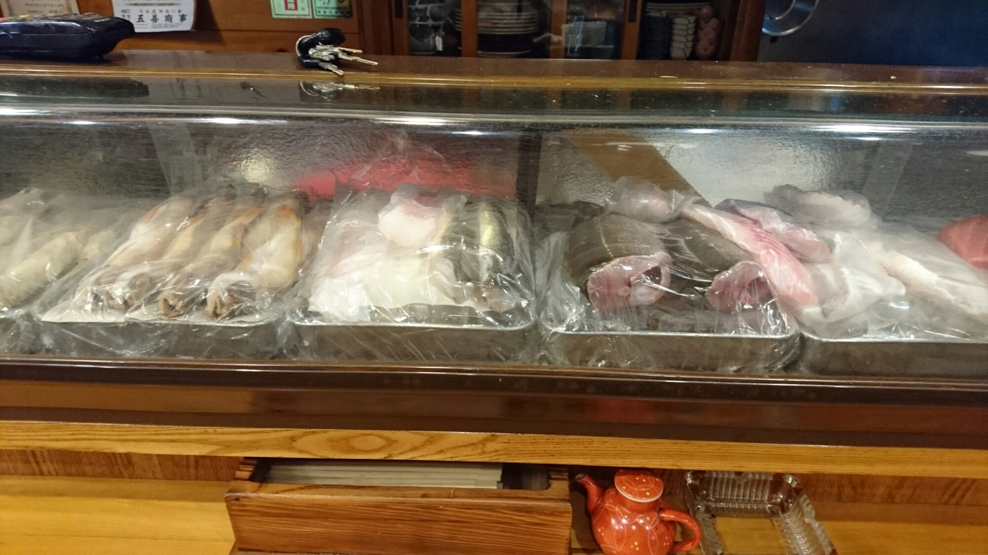 水ダコの吸盤、めじな、いさき、真鯛、丸イカ、