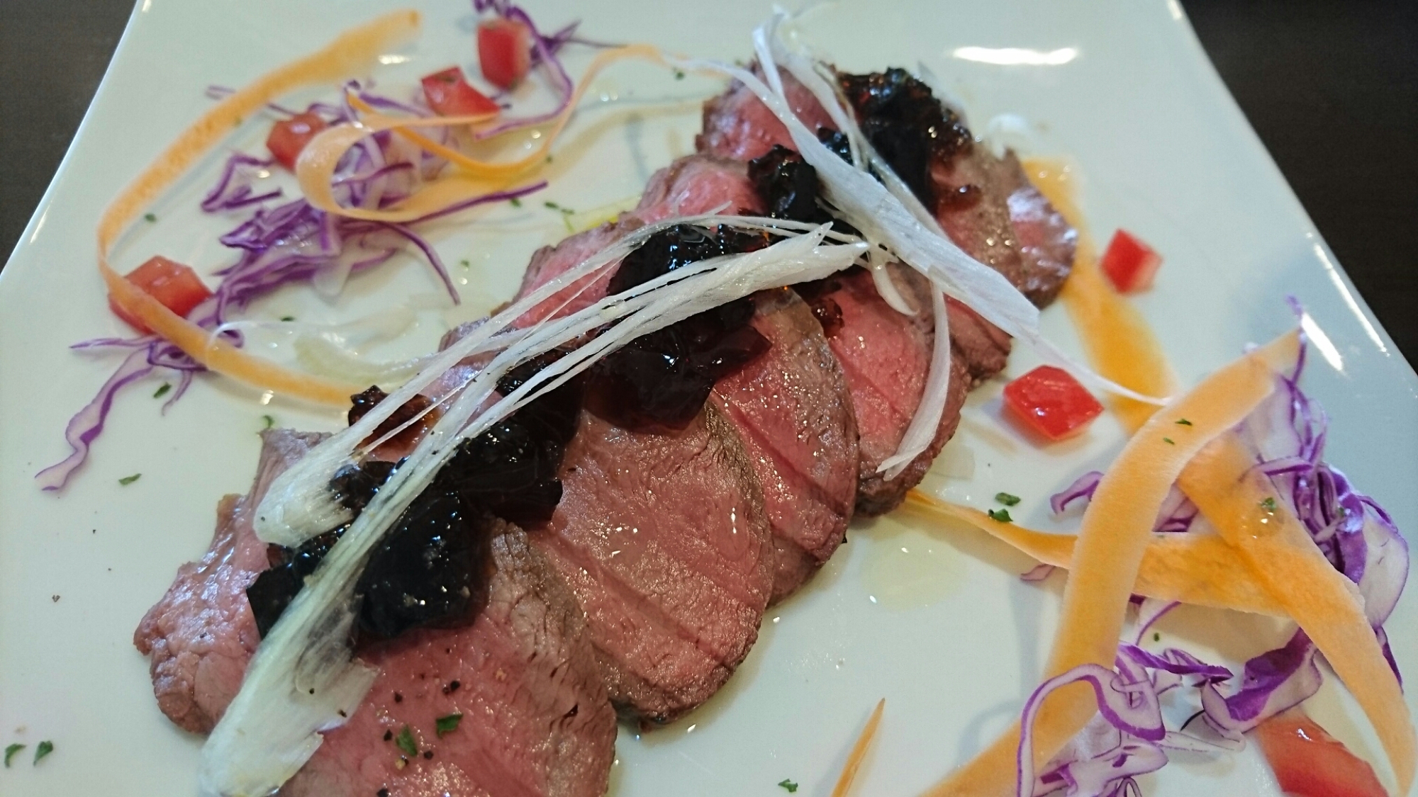 牛のたたきは、低温ロースト。ちょっとローストビーフ風なのが嬉しい♪ポン酢につけず、ゼリーっぽいジュレと一緒に頂くのが、お洒落っぽいですよね。本格的なお味を楽しんで頂けます!