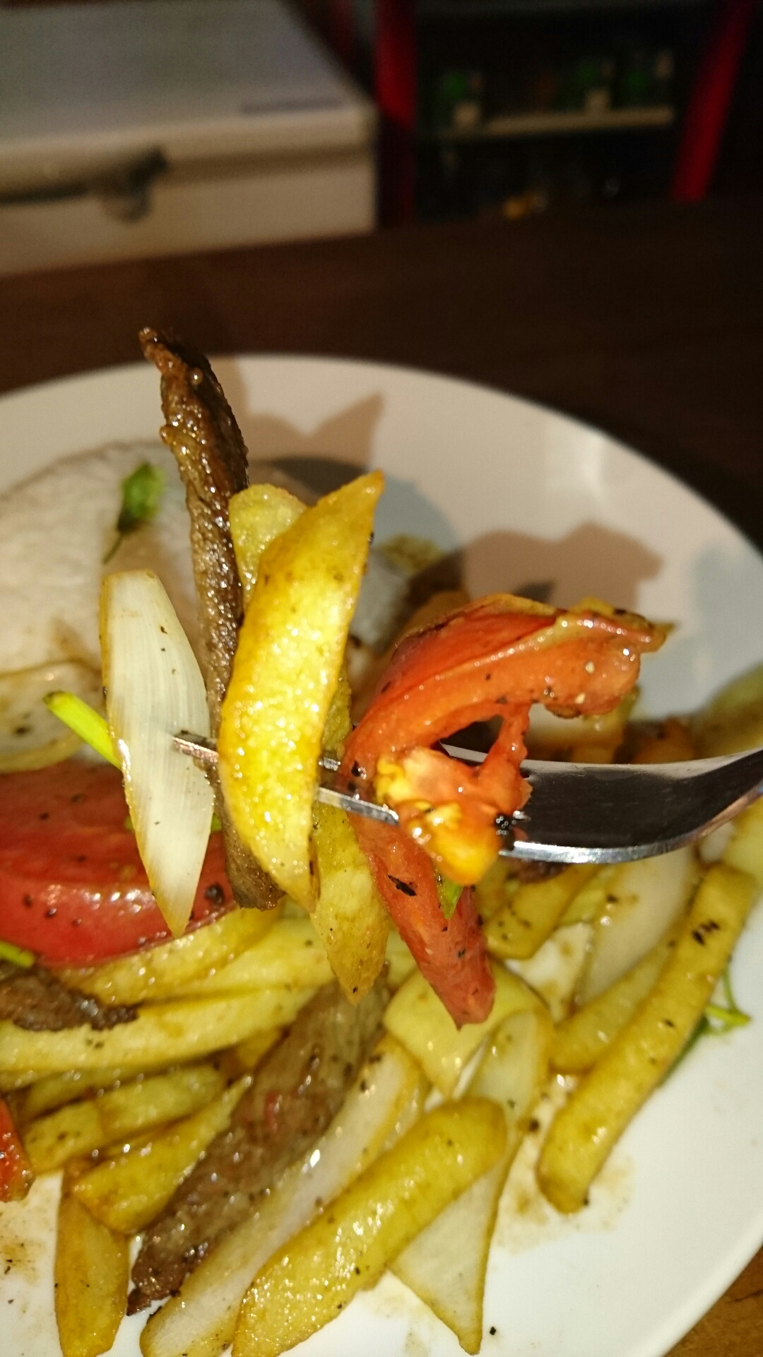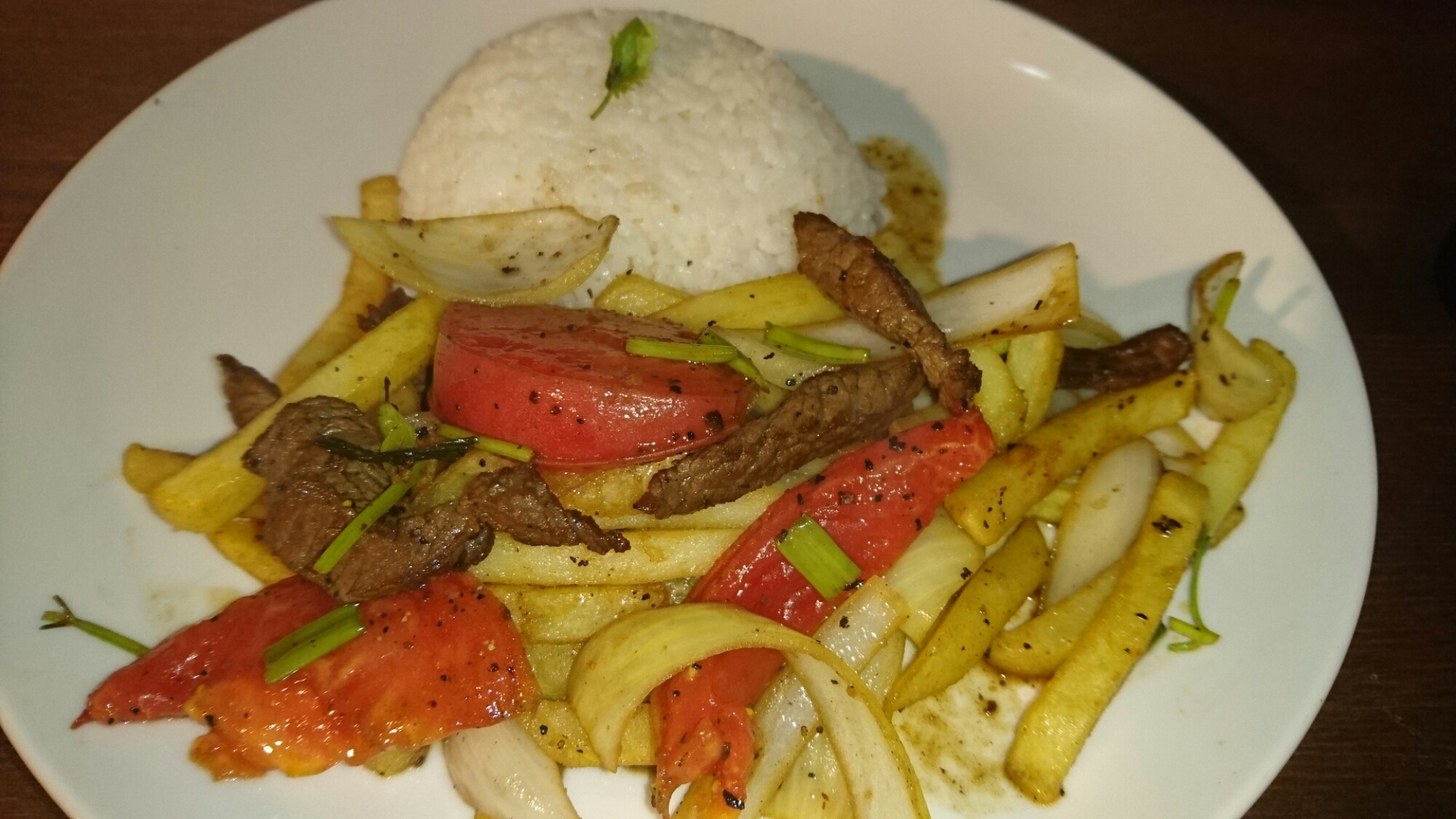 “ロモ サルタド” 牛肉、ポテト、玉ねぎ、トマトをコリアンダーで炒めたお料理。