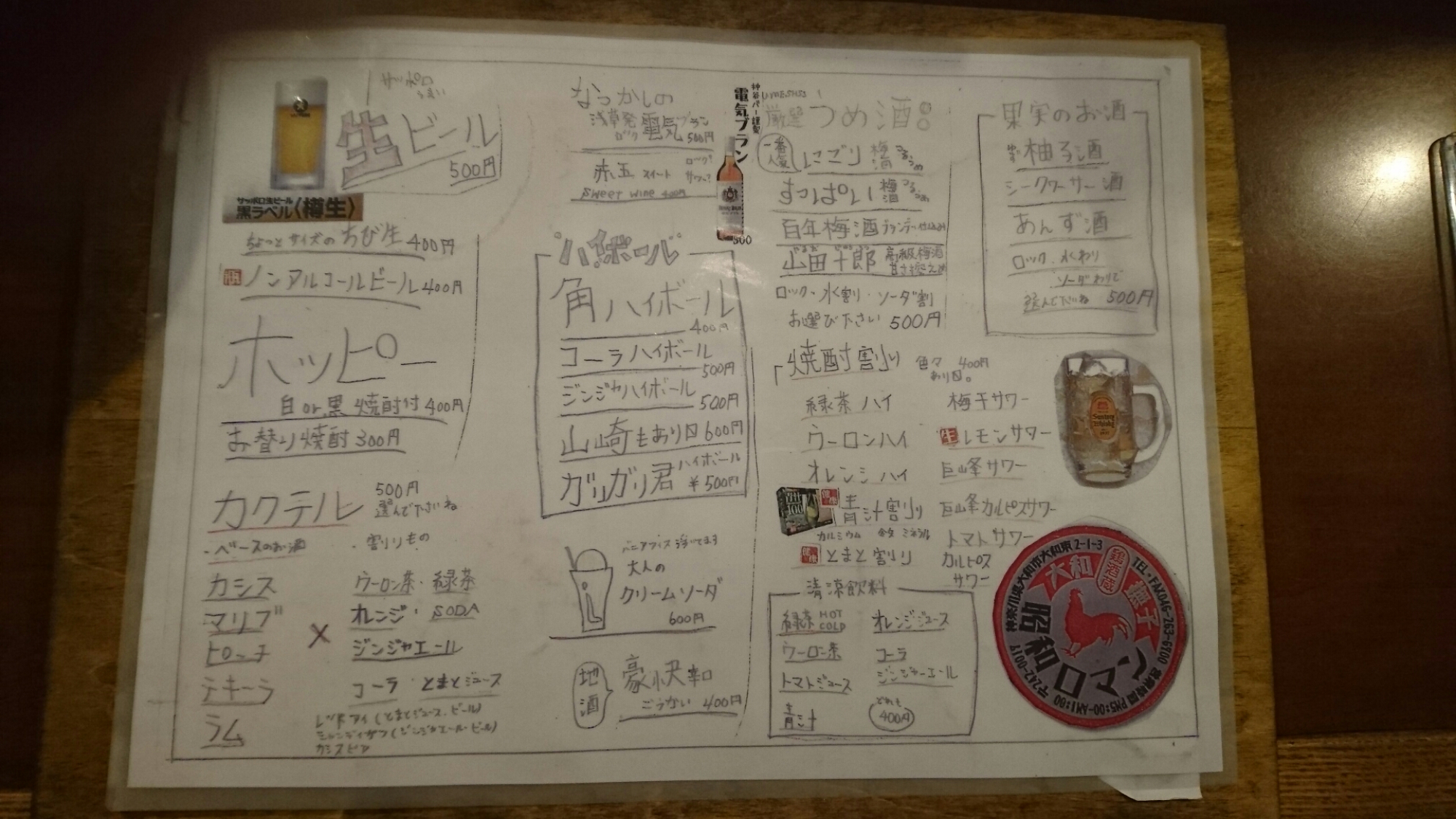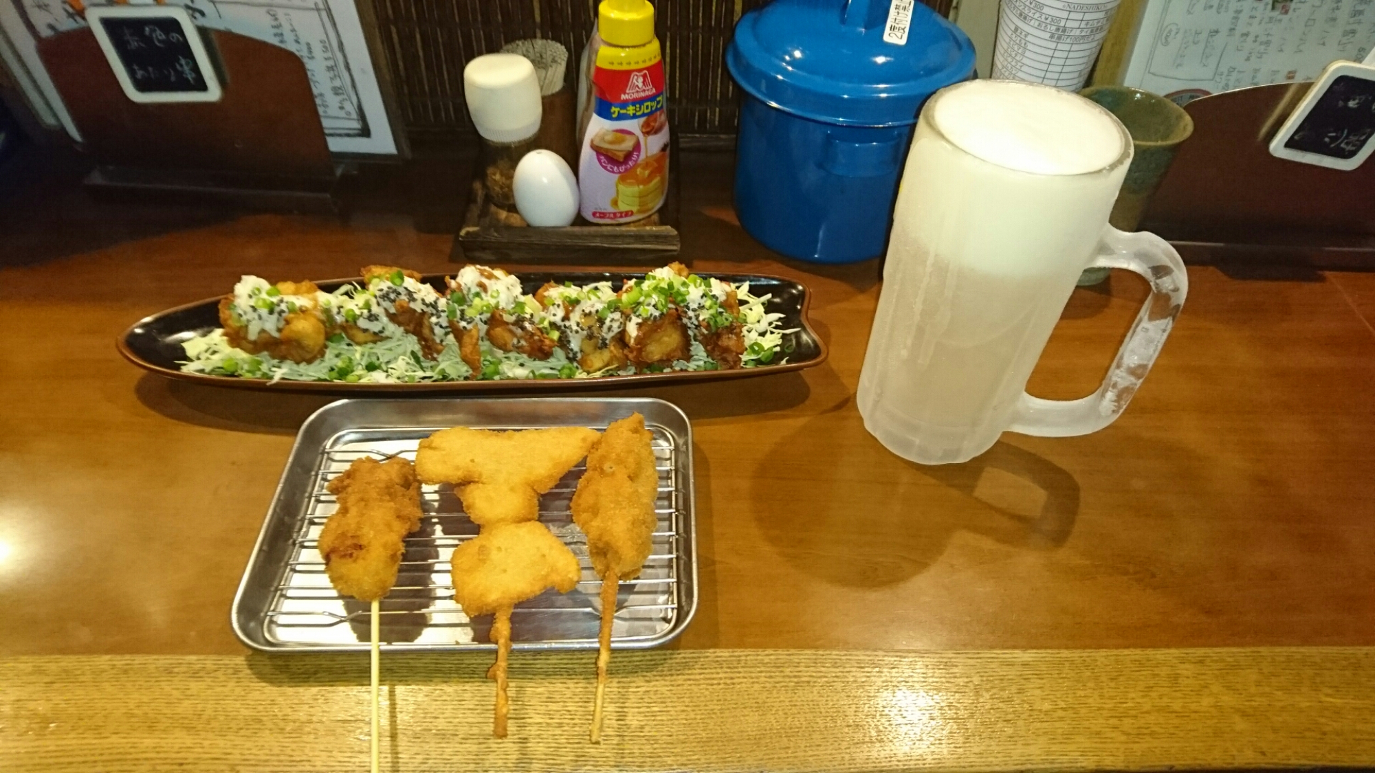 さこりメニューの串揚げ3種(もも、紅しょうが、牡蠣)+ドリンクで、なんと、500円のワンコインで‼‼