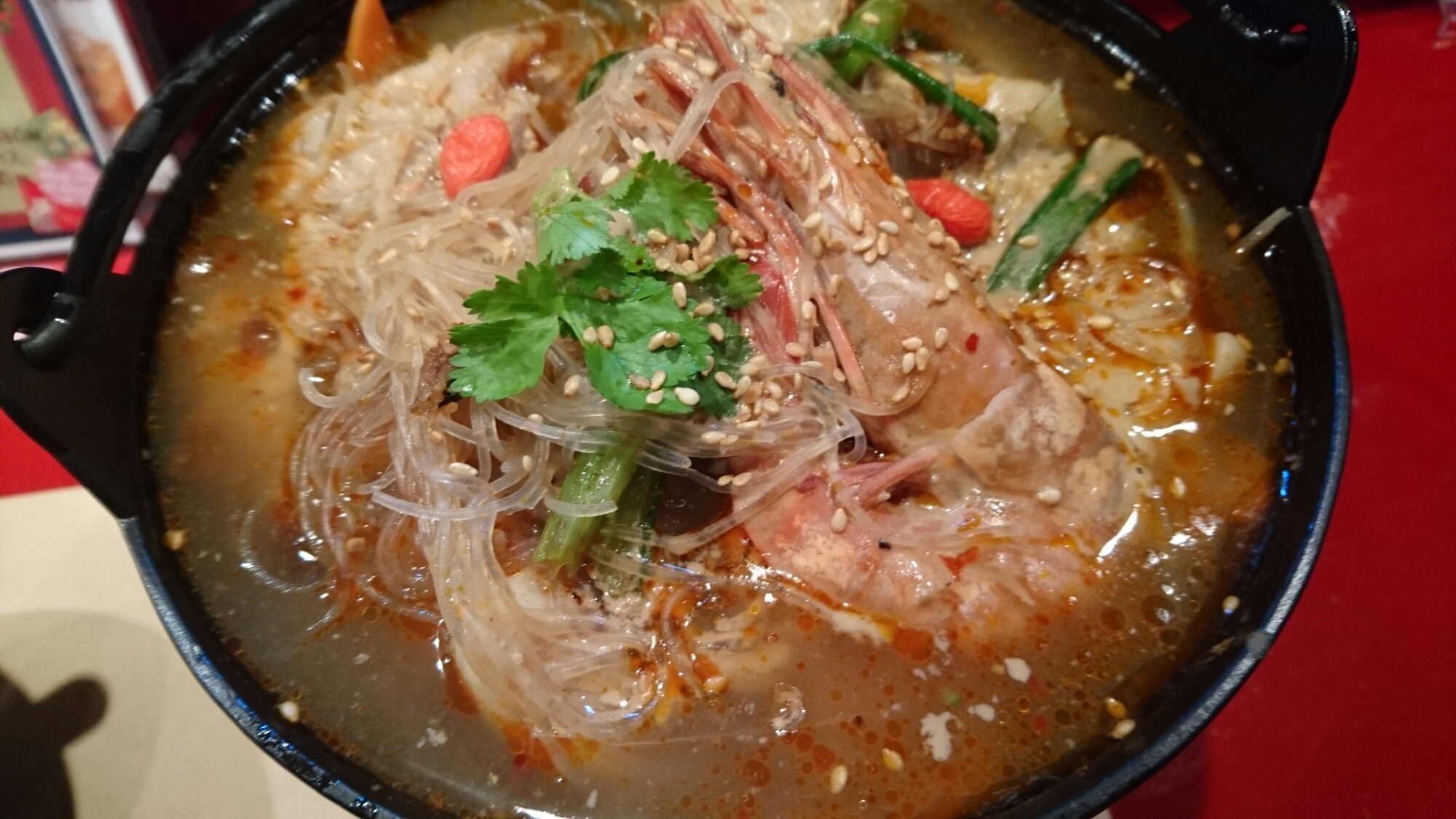 具は、エビ、イカ、ホタテ、カレイなどの海鮮と、白菜、チンゲン菜、小松菜、春菊、さつま揚げ、春雨など。