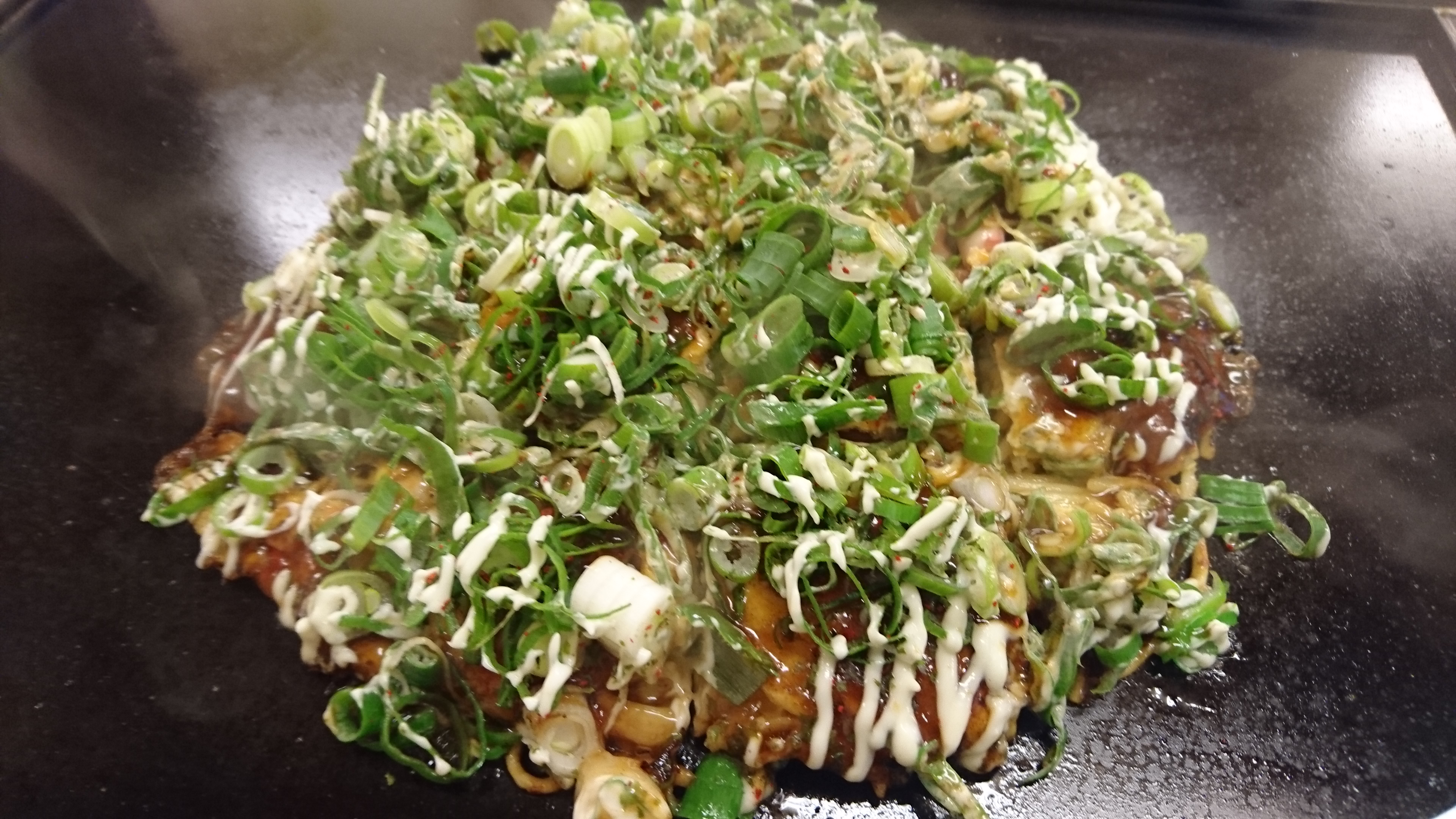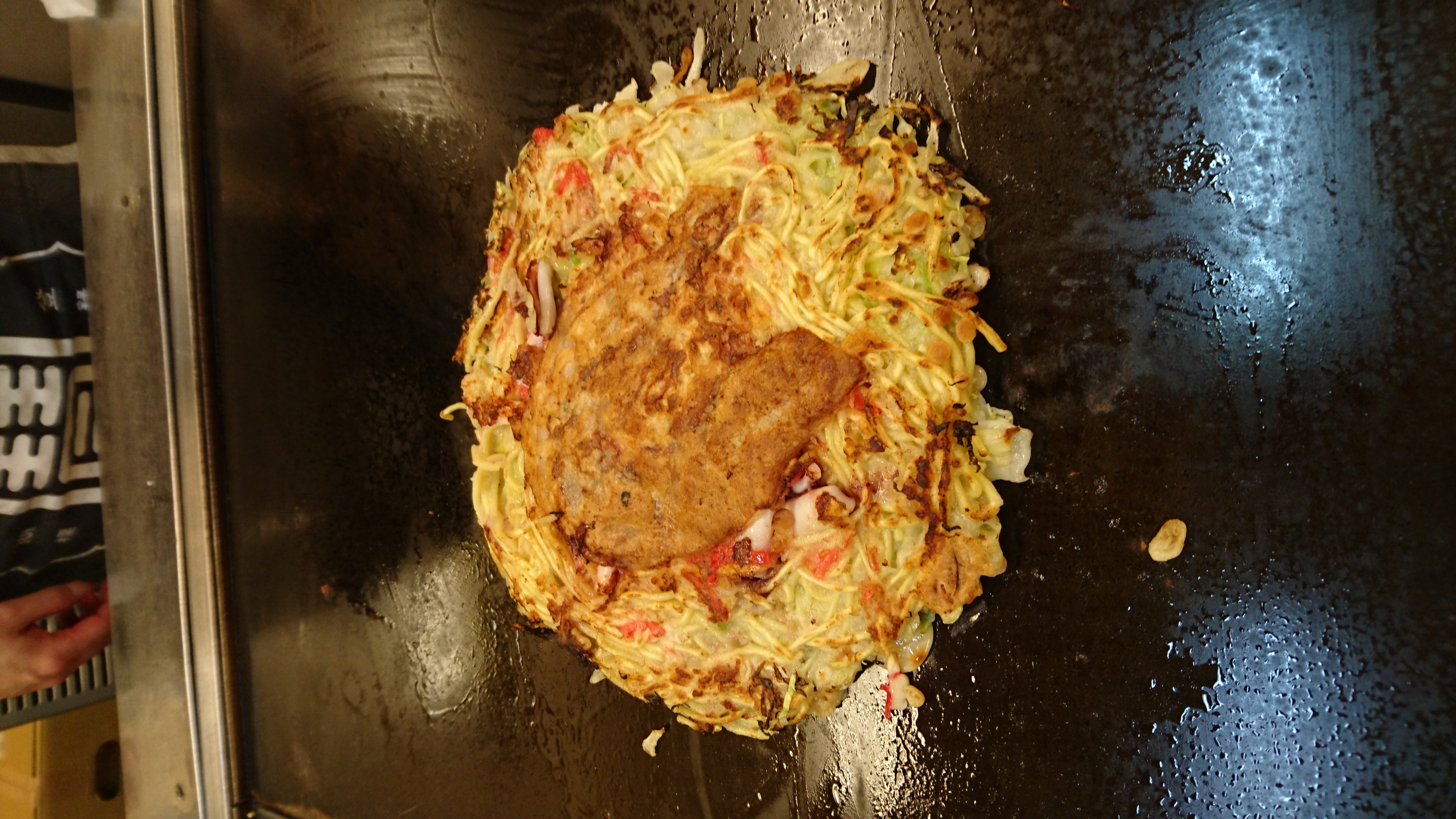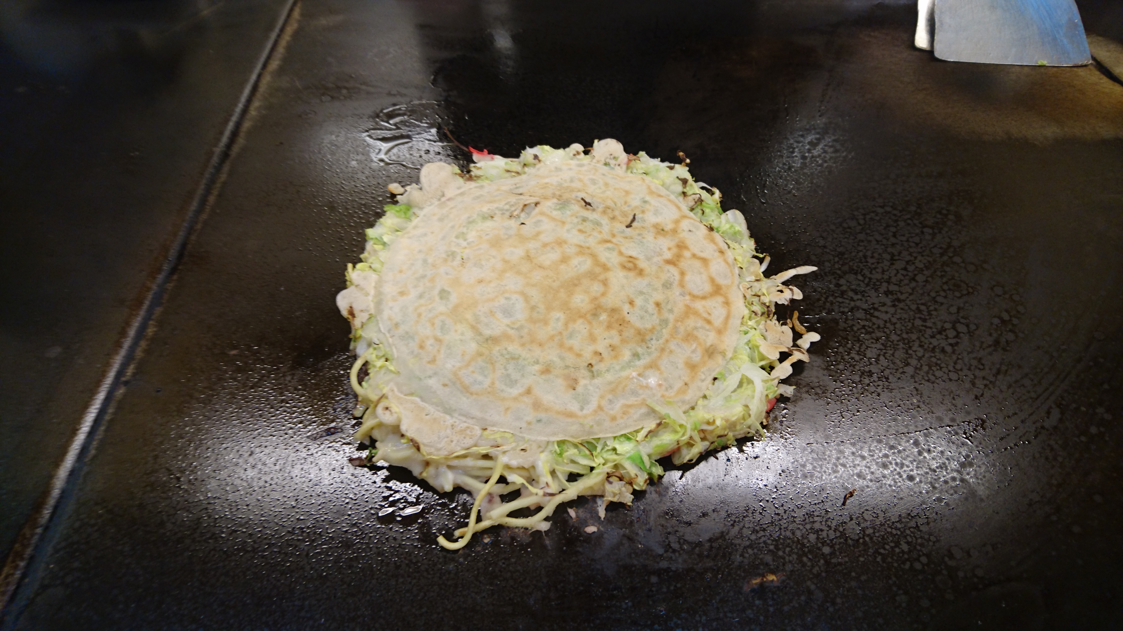 うすーーーい生地に、キャベツ、イカぶた、焼きそばの麺と、紅しょうが。焼き上がりに、玉子、それに、青ネギをわっさわっさと乗っけた、たもスペ‼‼