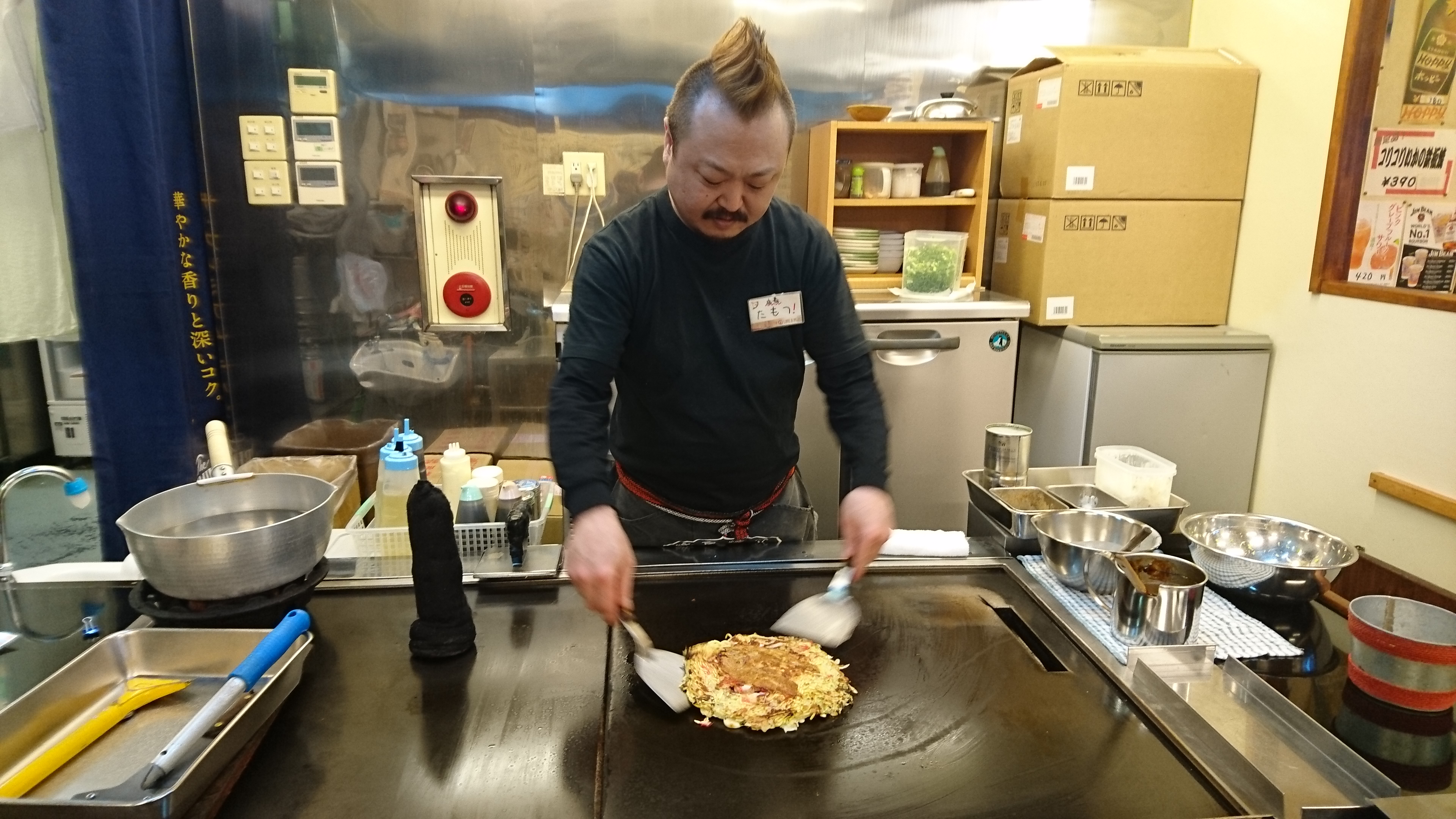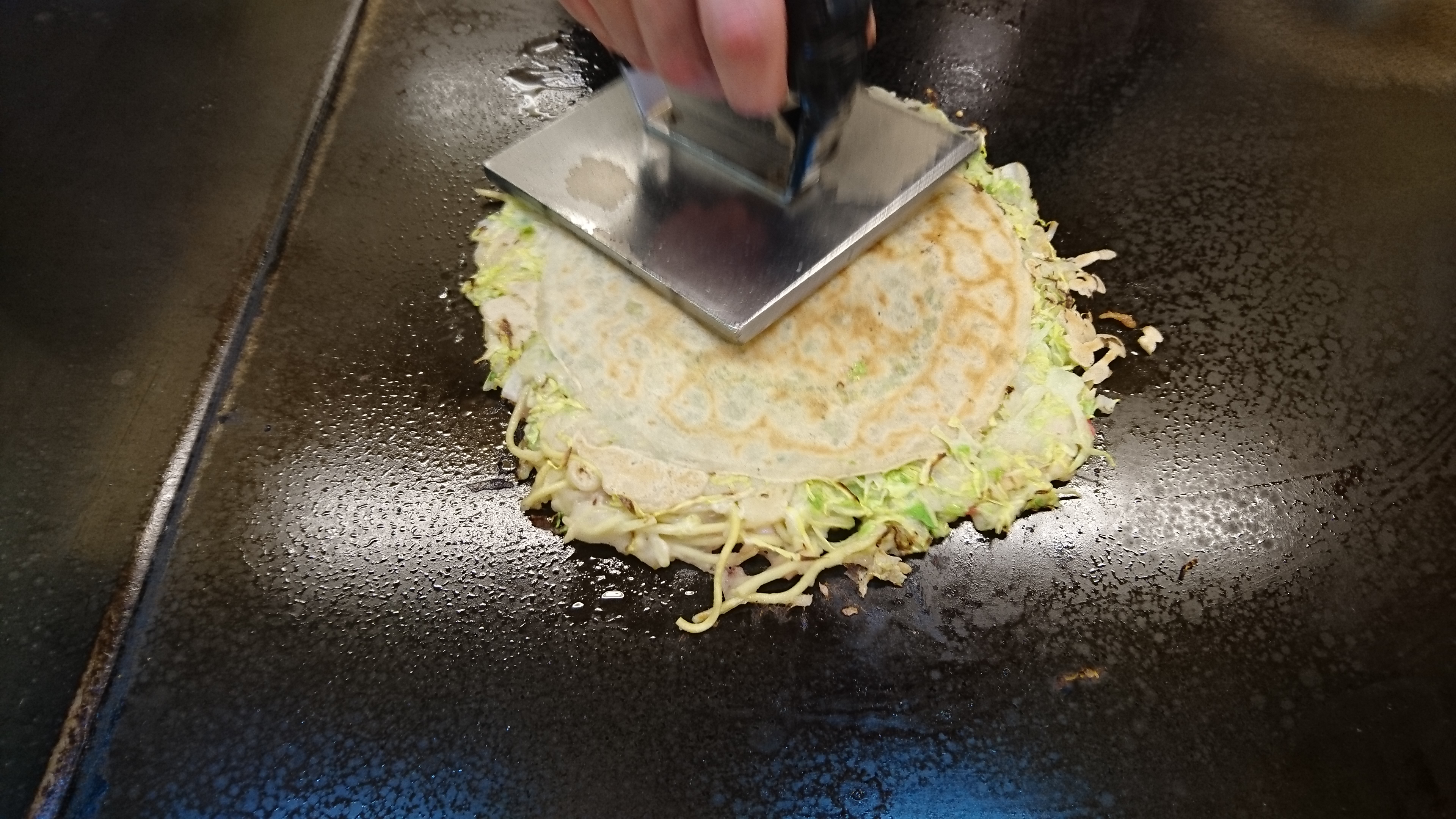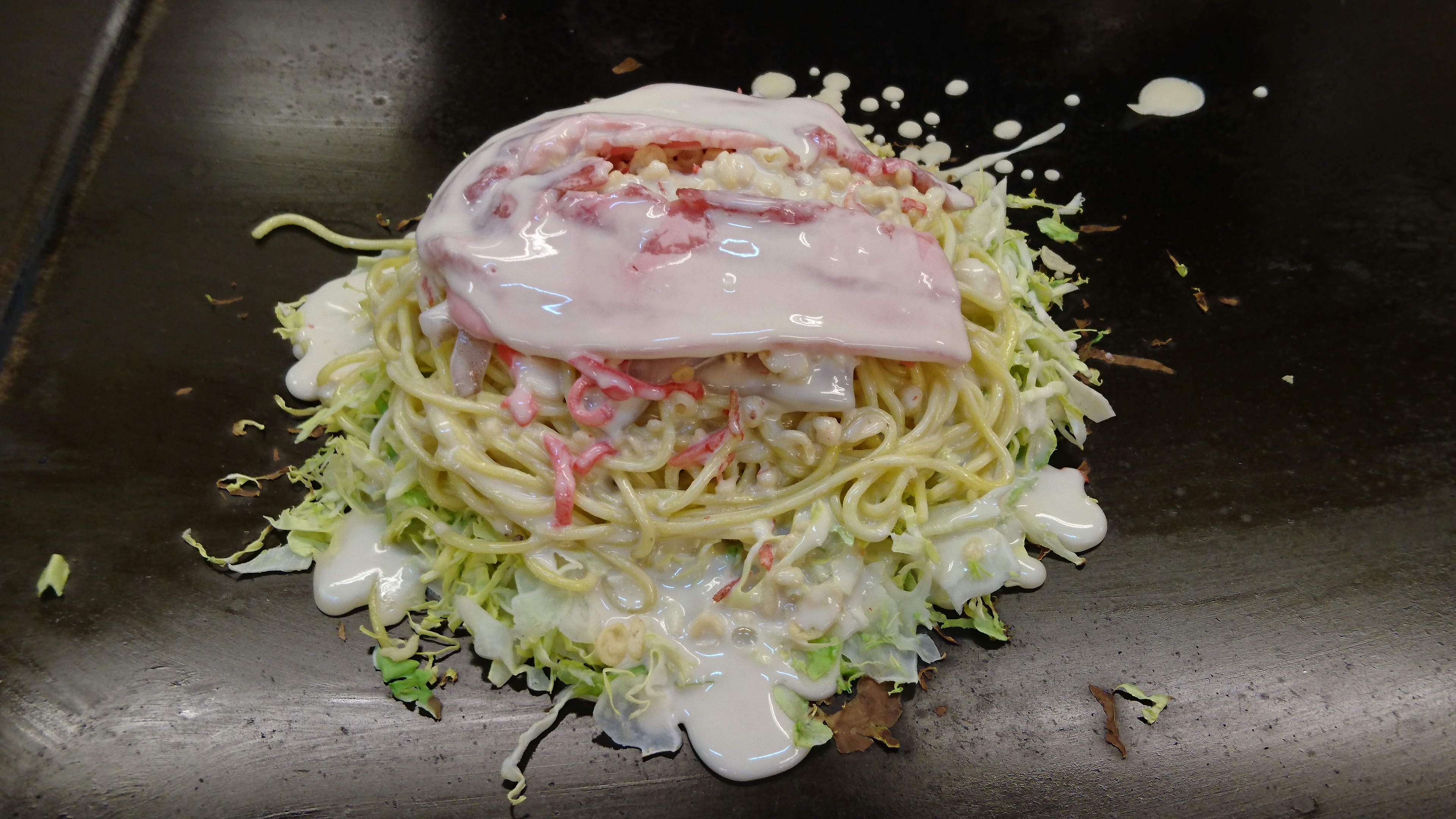 うすーーーい生地に、キャベツ、イカぶた、焼きそばの麺と、紅しょうが。焼き上がりに、玉子、それに、青ネギをわっさわっさと乗っけた、たもスペ‼‼