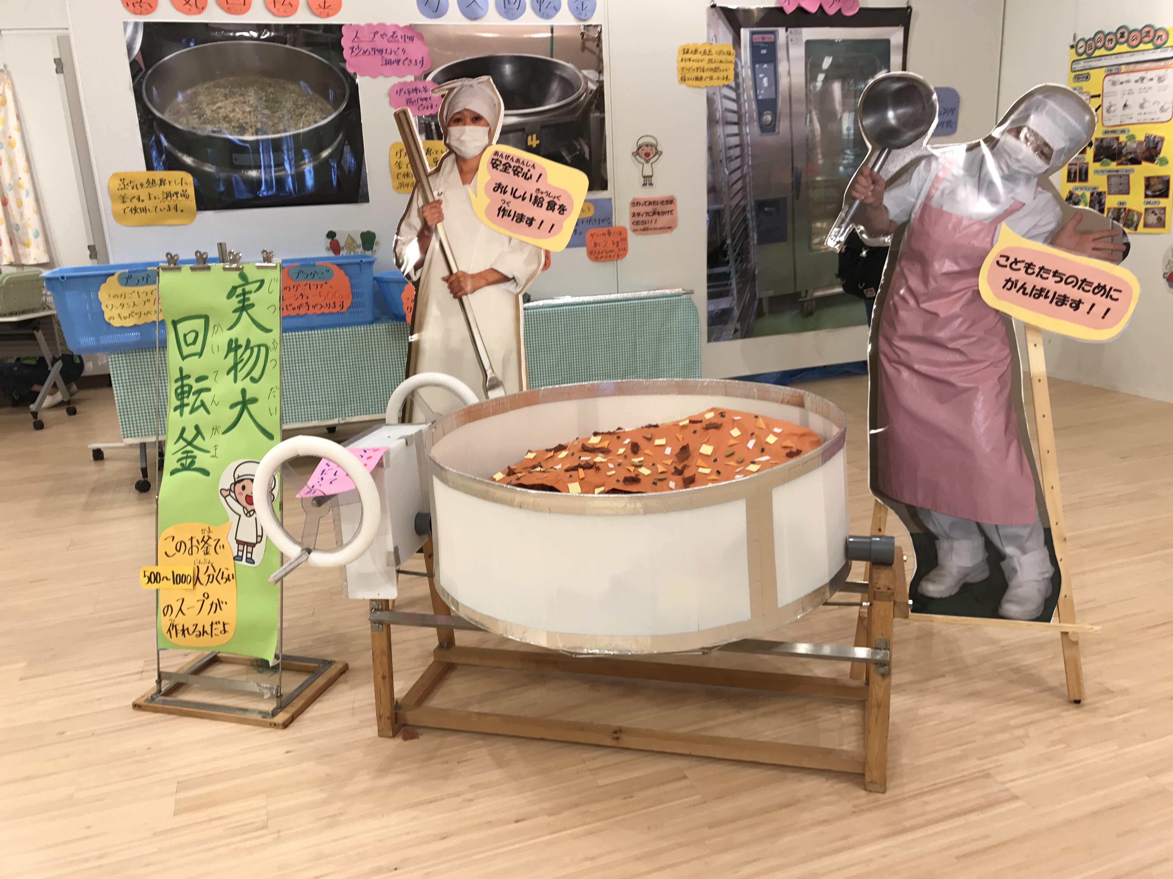 ここでは学校給食がよくわかる手作りのパネルの展示や、調理器具の体験コーナー、給食時間の模擬体験コーナーが楽しめます!