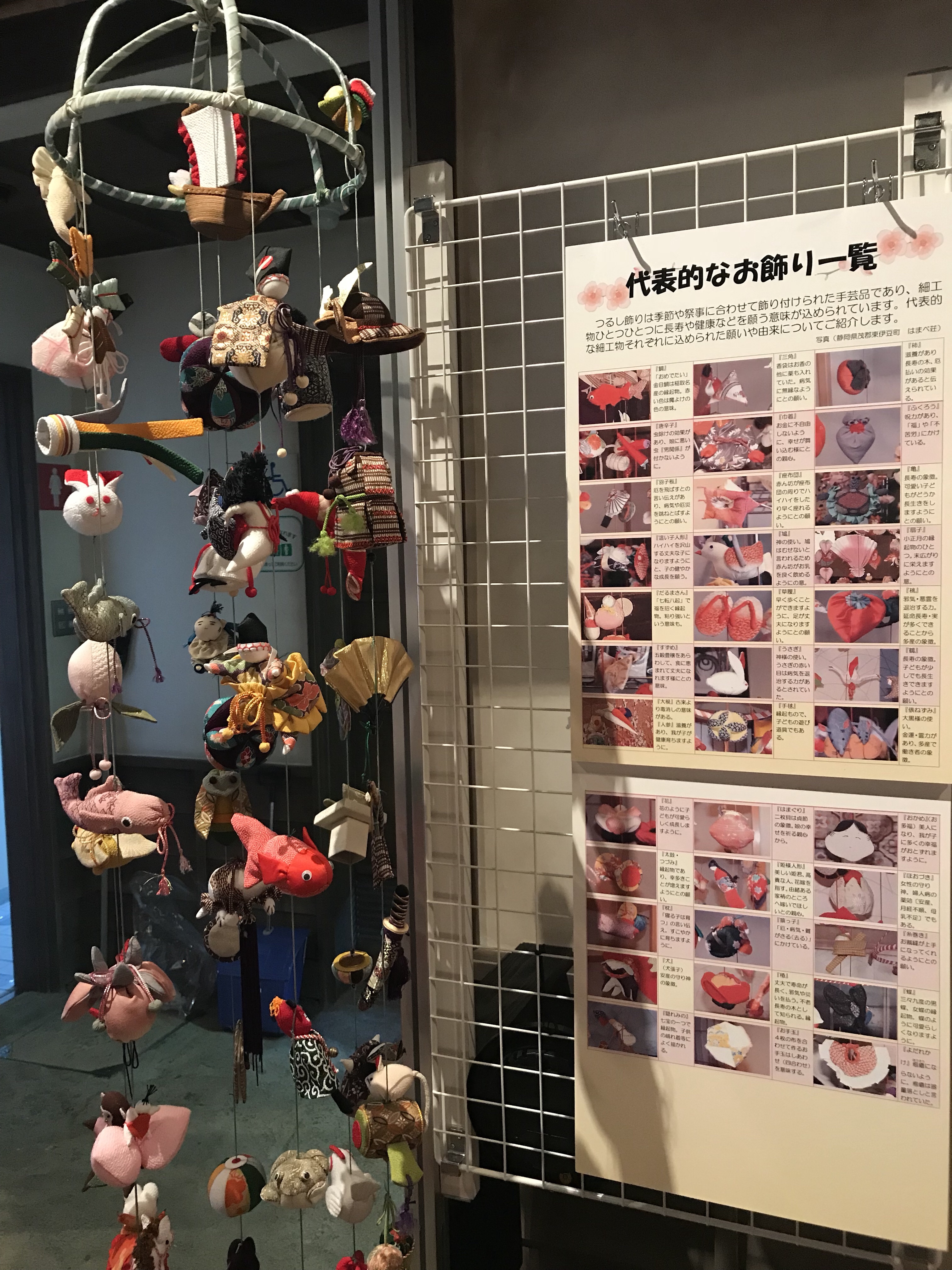 座布団やウサギ、タイなど沢山の人形が吊るされています!