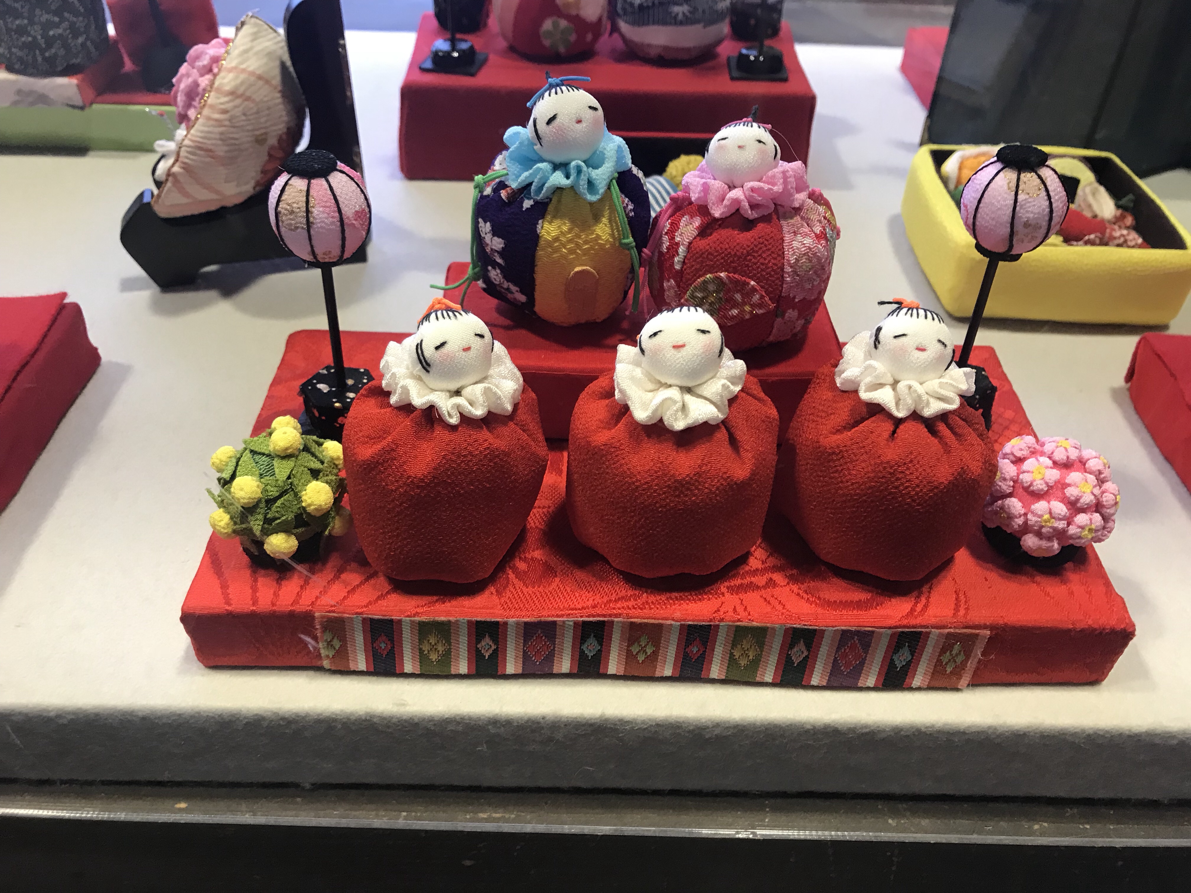 座布団やウサギ、タイなど沢山の人形が吊るされています!