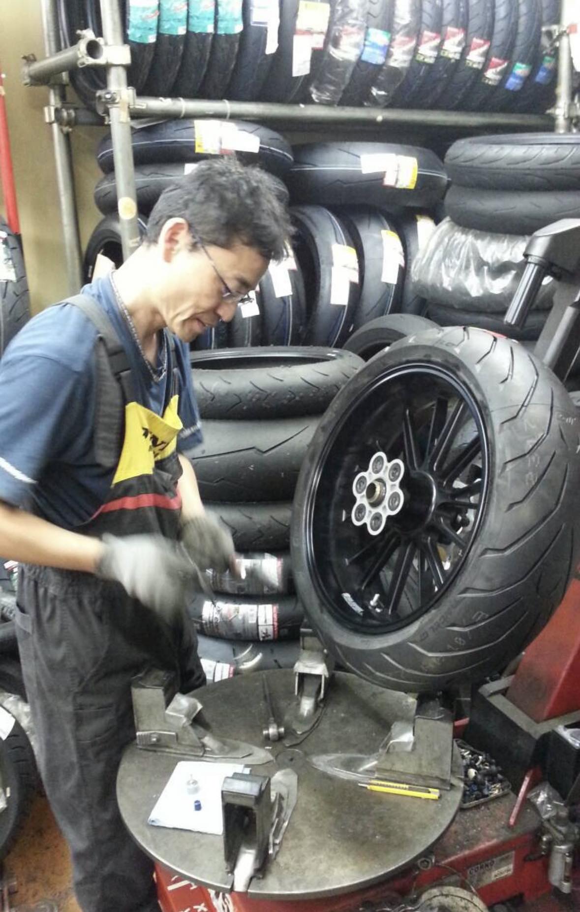 多摩市出身、日野市在住、56歳。バイク歴は16歳から40年。きっかけは、小学生の頃から雑誌を買うほどバイクに興味あり、必然的に16歳の誕生日に原付を取得する。10代は筑波選手権などのレースに参戦。バイクレーサーになりたくて、正社員でレースをやらせてくれるタイヤ店に就職をする。わずか数年で上司が辞めてしまい、店員は21歳の久下さん一人、店長となる。その後、本社より店を閉店することが伝えられるが、独立を決意。平成11年11月11日に レーシングマックス府中店を有限会社 ドライダーズ 代表として引き継ぎ、今日まで37年間タイヤ交換一筋で、経営してきた。なんとタイヤ交換したバイクは3万台以上だ。