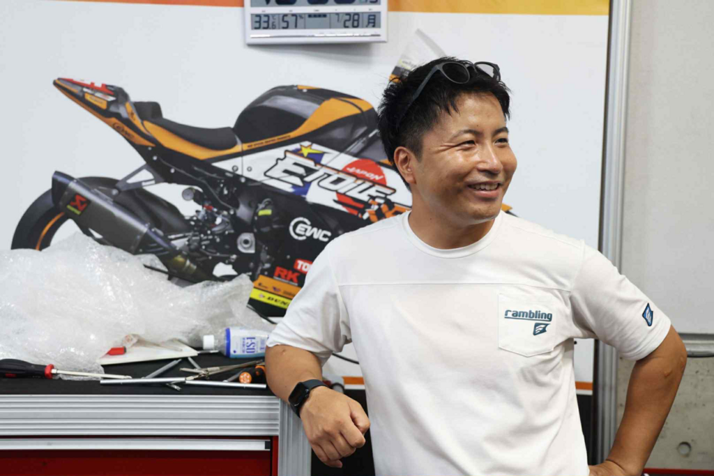 バイク歴14歳から20年。バイクは兄弟が乗っていて、最初に広場で乗り始めたら楽しくて始める。その後次々にレースに出場しステップアップし勝ち抜いてきた。