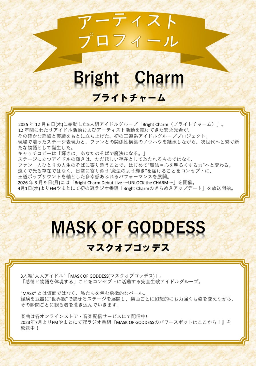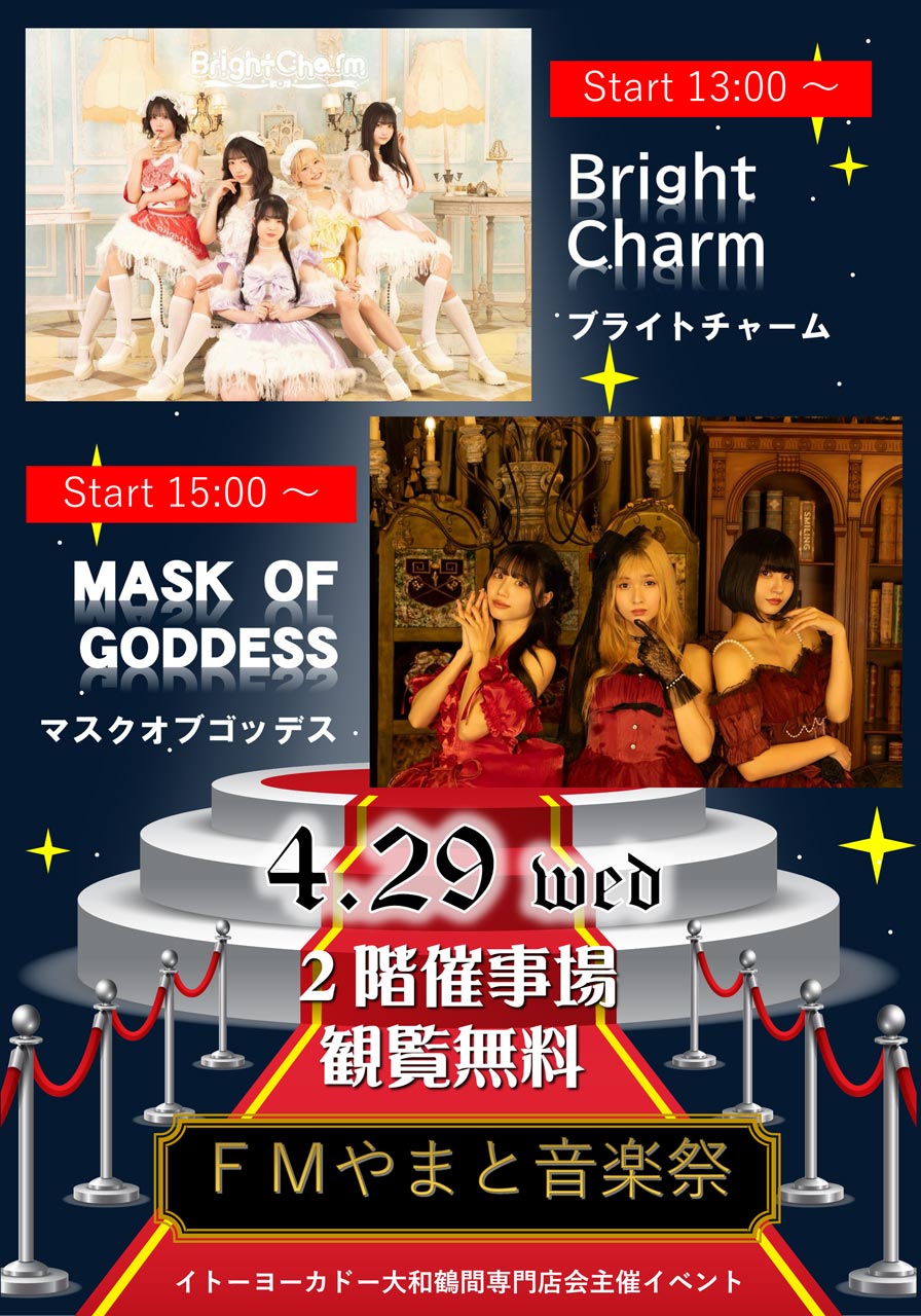 イトーヨーカドー大和鶴間店にて、FMやまと 音楽祭開催。2025年12月6日(木)に始動した5人組アイドルグループ「Bright Charm(ブライトチャーム)」と、3人組 “大人アイドル”「MASK OF GODDESS(マスクオブゴッデス)」が登場。多幸感あふれるパフォーマンスを展開する王道系アイドルグループと、観る者を惹き込む完全生歌アイドルグループ。それぞれの個性が光るステージをお楽しみください。